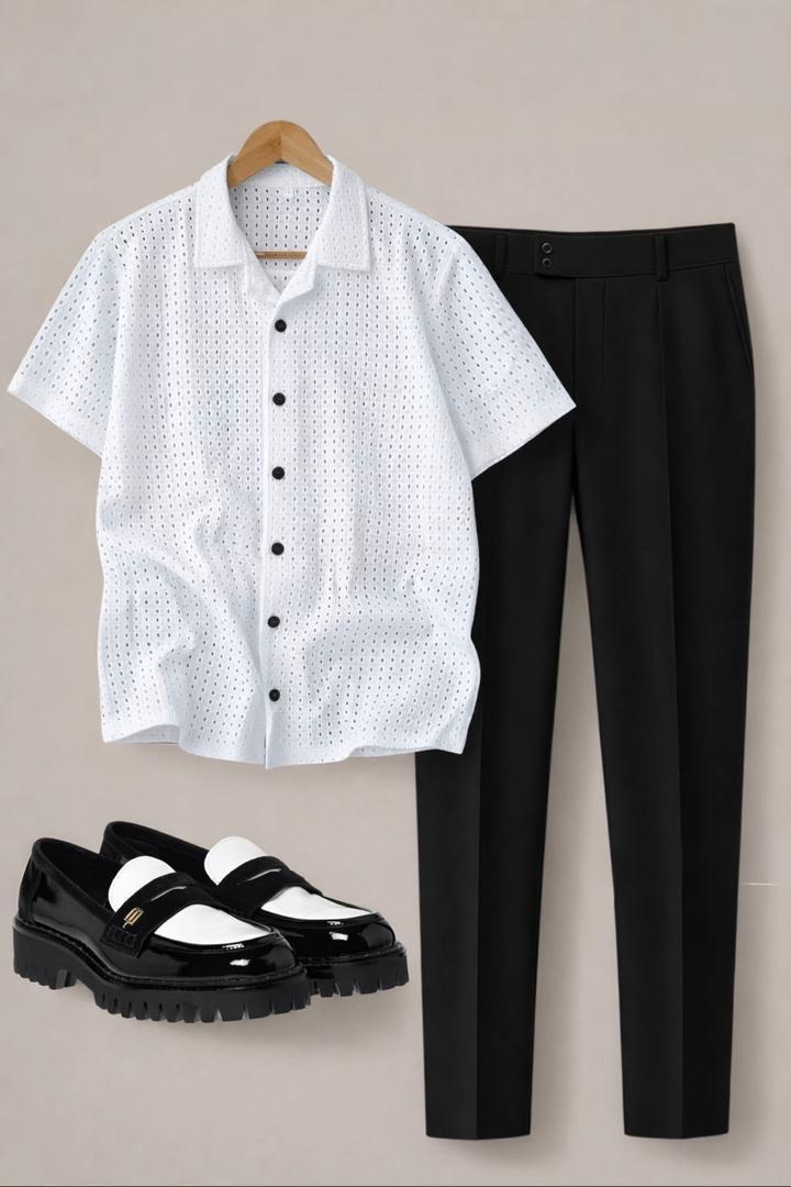 A crisp white short-sleeve textured button-down paired with tailored black trousers for a sharp, modern silhouette. Finished with chunky black-and-white loafers, this outfit blends simplicity with bold detail — perfect for effortless smart-casual styling.