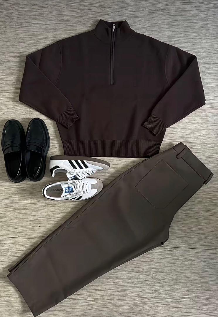 A refined old-money ensemble built around a deep chocolate quarter-zip knit with clean lines and structured cuffs, paired with tailored brown trousers for a seamless, tonal look. Finished with classic loafers or minimalist trainers, it balances heritage elegance with modern restraint-polished, composed, and quietly confident.