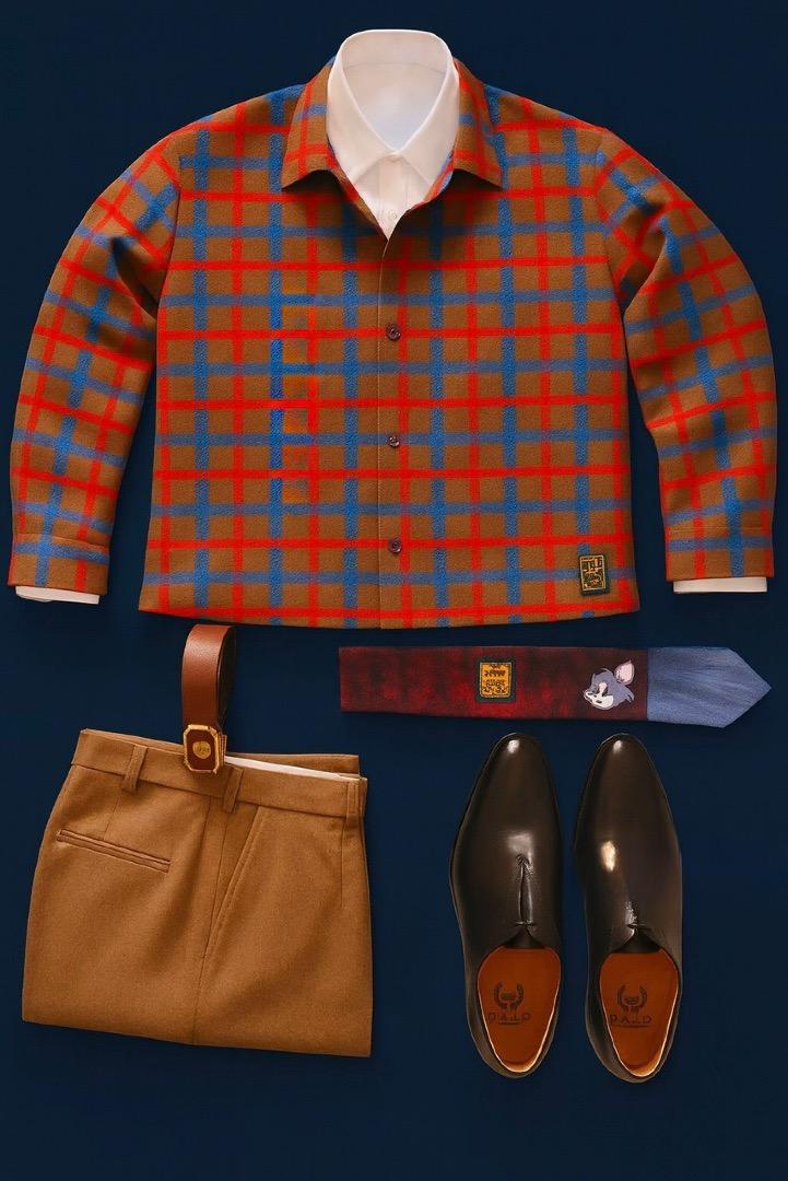 A cropped wool plaid jacket layered over a crisp white shirt, paired with tailored camel trousers and polished leather loafers. Warm tones and classic checks evoke aristocratic countryside ease.