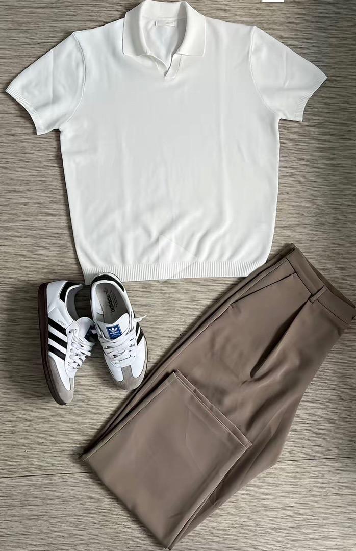 A timeless warm-weather look featuring an ivory knit polo with a soft collar and ribbed hem, styled with tailored taupe trousers for a light, aristocratic palette.
