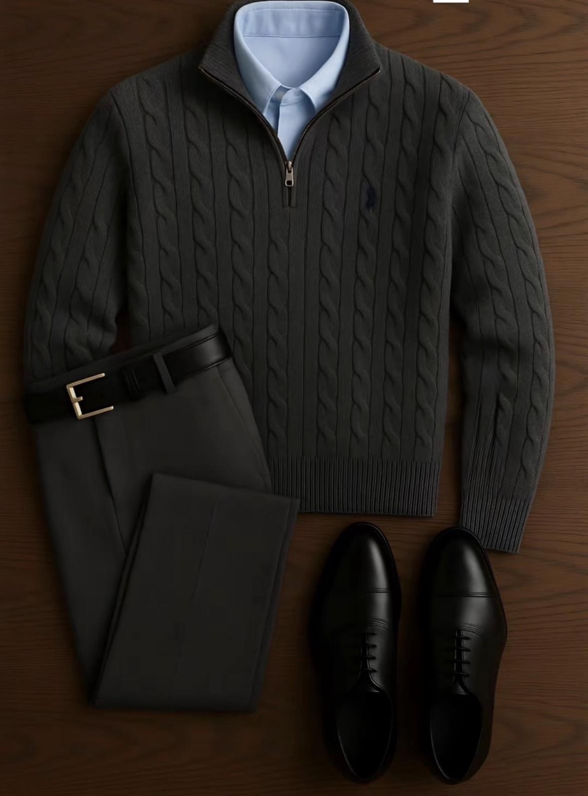 A sleek old-money look built on quiet confidence: a textured charcoal knit layered over a crisp blue shirt, paired with tailored dark trousers and polished black leather shoes. Clean, classic, and effortlessly refined.